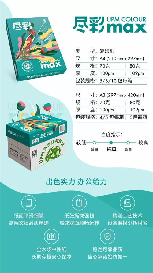 尽彩复印纸色泽鲜亮,纸质细腻,纤维均匀,纸面无明显的正反差,挺度好友弹性。 白度:LSO白度,亮度,对457波长反射率。(如摄氏温度)CLE白度,视觉白度,全光源德反射总和。(如:华氏温度) 色相:造纸用的漂白剂,增白剂和色素,在浆纤维自身白度上提高10度以内为限。强行增白,在灯光下看还是灰暗,过度增白纸会变脆,很快会泛黄变暗。 平整度:看复印纸过机前的平整度和过机后的平整度。 灰粉高低:静电复印纸中灰粉不超过15%为好,高了透气性差,复合印后纸会曲卷。 掉粉:纸张在使用过程中均有粉尘掉出,掉粉要少,粉尘的颗粒要细为好纸。